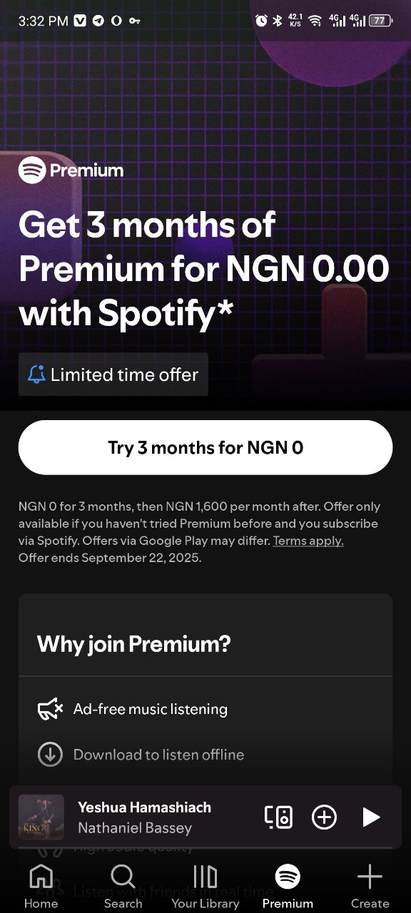 این محصول ویژه کاربرانی است که پس از ورود به حساب اسپاتیفای، آفر اختصاصی (۳ ماه رایگان یا پیشنهاد ویژه 2ماه برای تمدید اشتراک قبلی) برای آنها نمایش داده میشود.